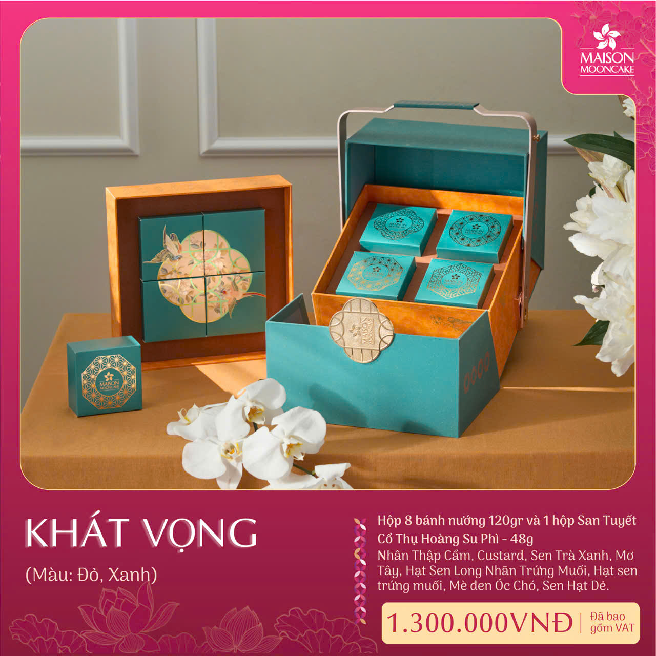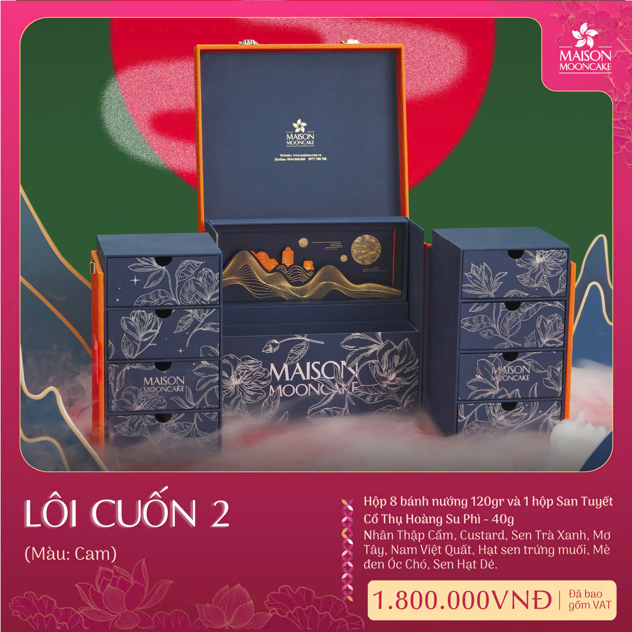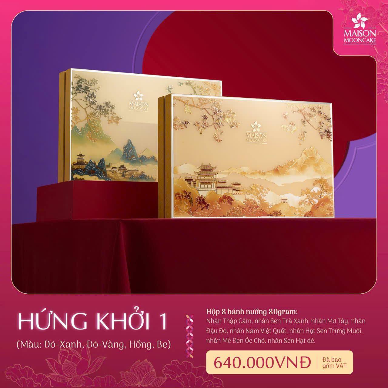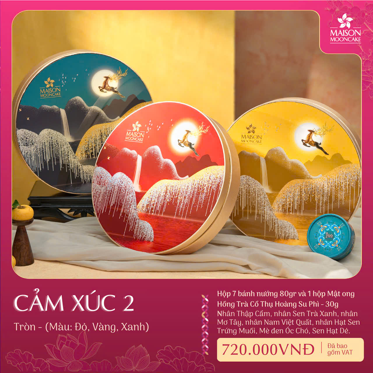- Nhân bánh: Thập cẩm – Custard – Mơ tây – Nam việt quất – Hạt sen trứng muối – Mè đen óc chó – Sen hạt dẻ – Sen trà xanh & Trà Phổ nhĩ cổ thụ Hoàng Su Phì 48g