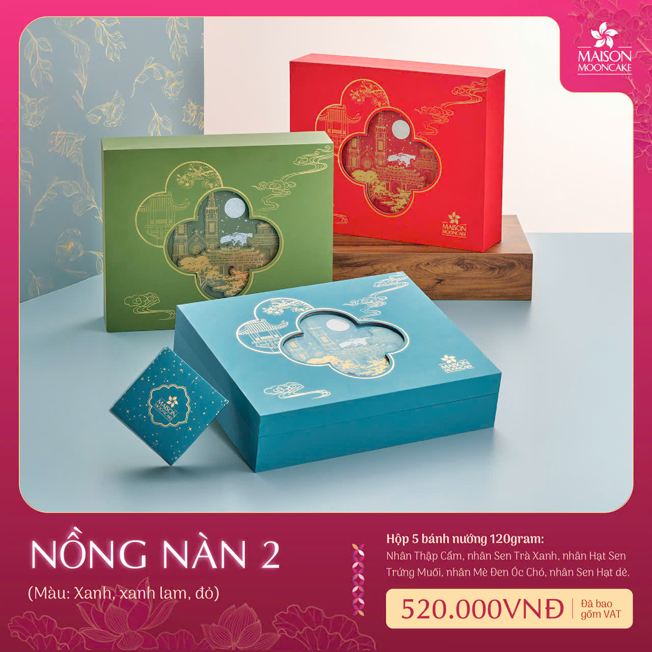 - Nhân bánh: Thập cẩm – Sen Trà xanh – Hạt sen trứng muối – Mè đen óc chó
