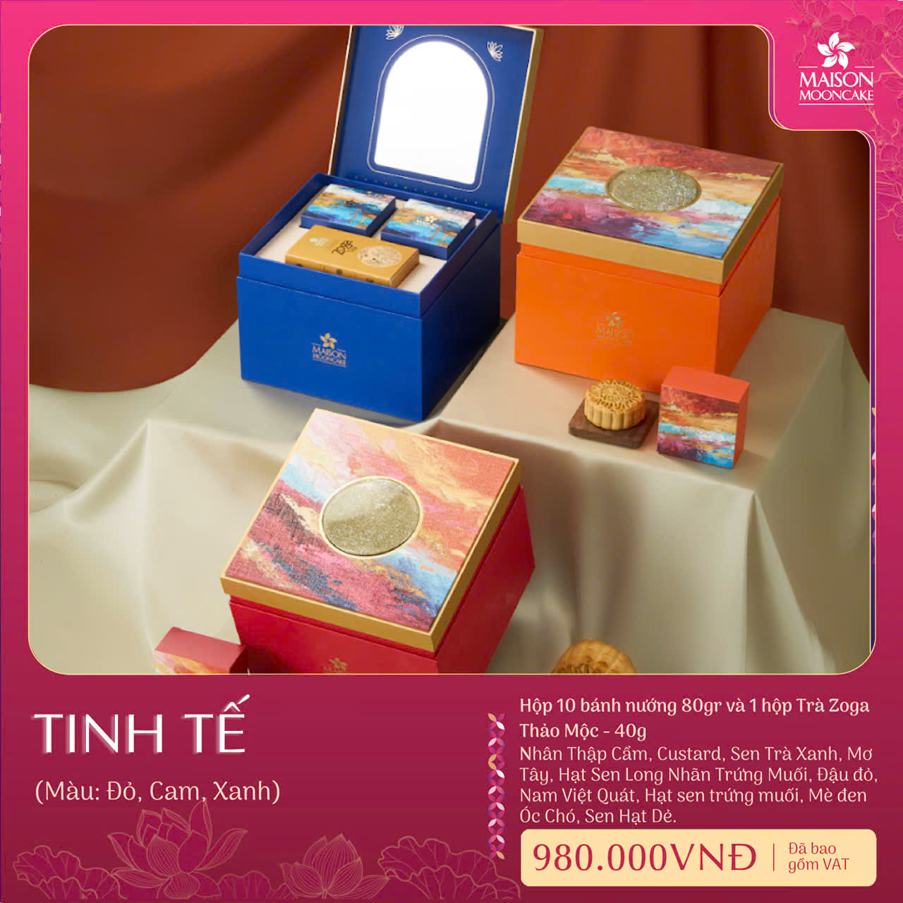 - Nhân bánh: Thập cẩm – Sen trà xanh – Mơ tây – Đậu đỏ – Nam việt quất – Hạt sen trứng muối – Mè đen óc chó – Hạt dẻ