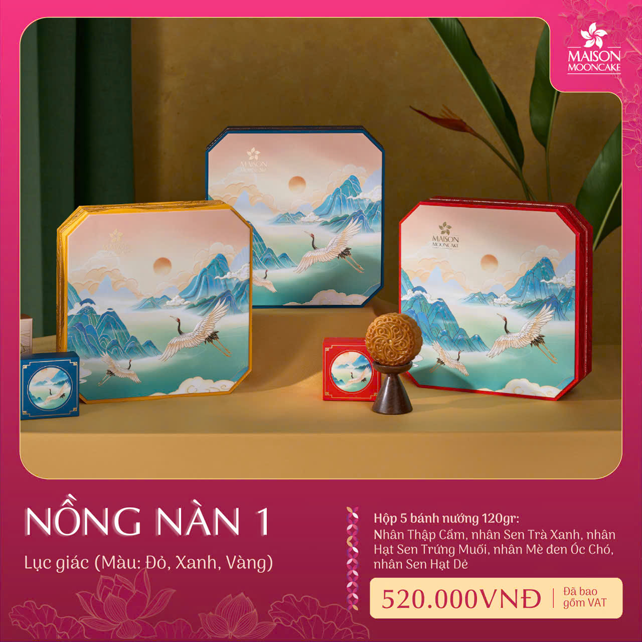 - Nhân bánh: Thập cẩm – Sen trà xanh – Hạt sen trứng muối – Mè đen óc chó – Hạt dẻ